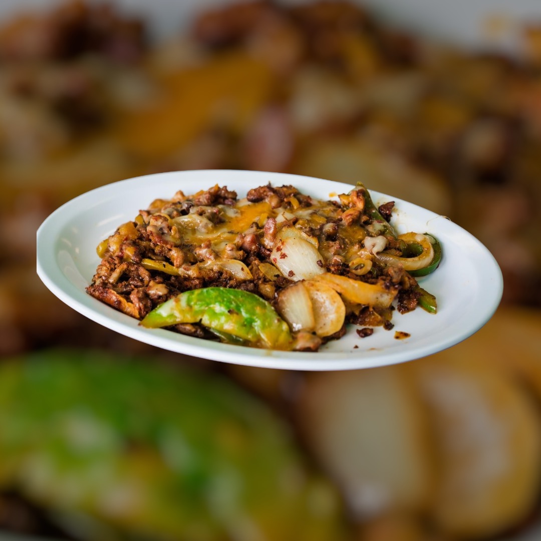 Grilled steak topped with chopped mexican sausage, bacon, green peppers, onions and melted mozzarella cheese. $ 12.95